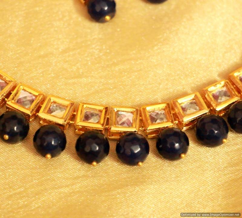 This beautiful necklace set is handcrafted in silver alloy with imitation blue onyx & kundan with meenakari work of very fine quality . This necklace set is coated with 18 kt gold polish which give them a unique look . An absolutely stunning piece to own and are very light in weight.