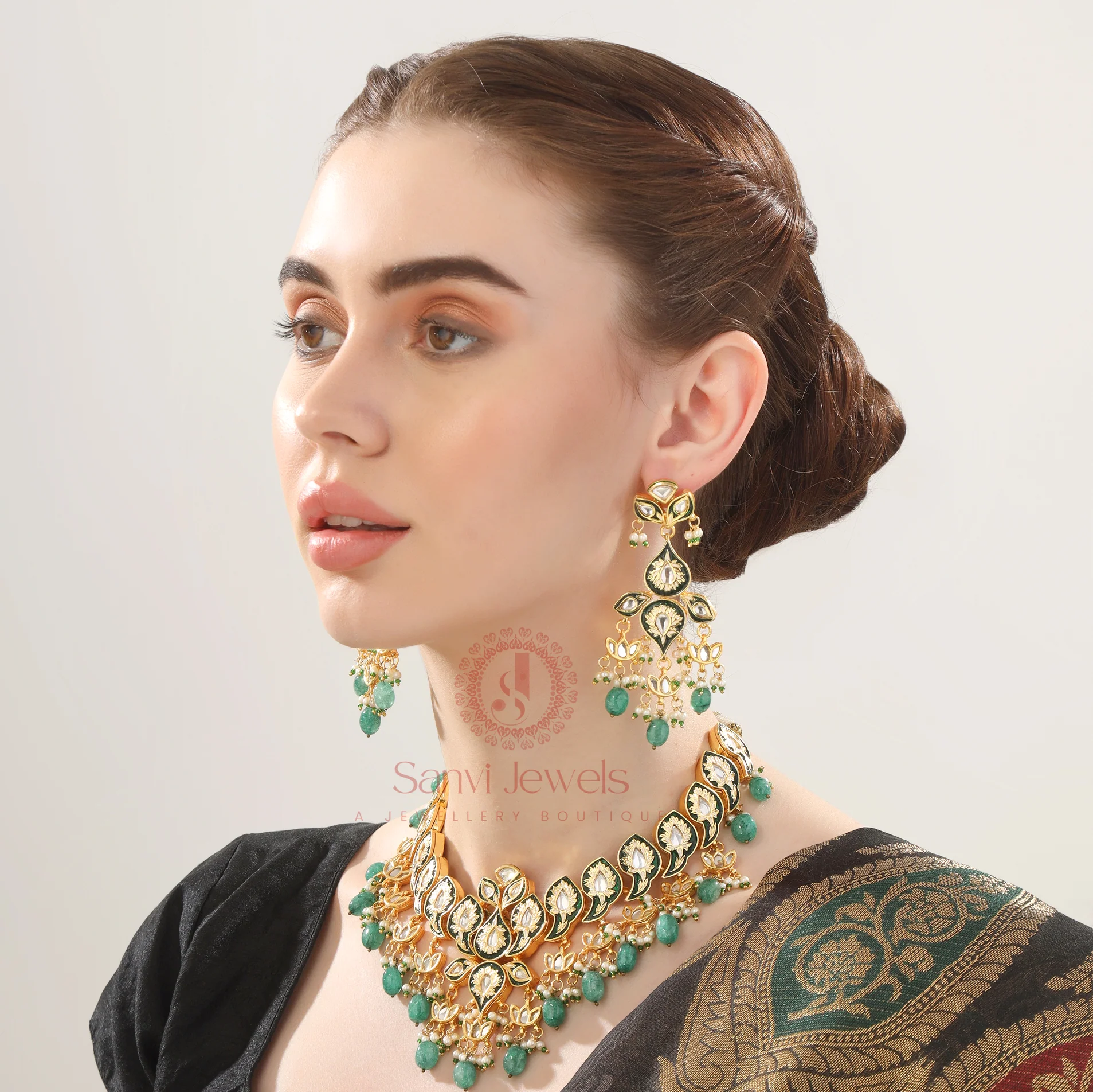 This green kundan polki necklace set Is handcrafted in silver alloy with imitation meenakari and onyx beads & pearls. the necklace set is coated with 18kt gold plating and nickle free plating to avoid allergy to the skin.
