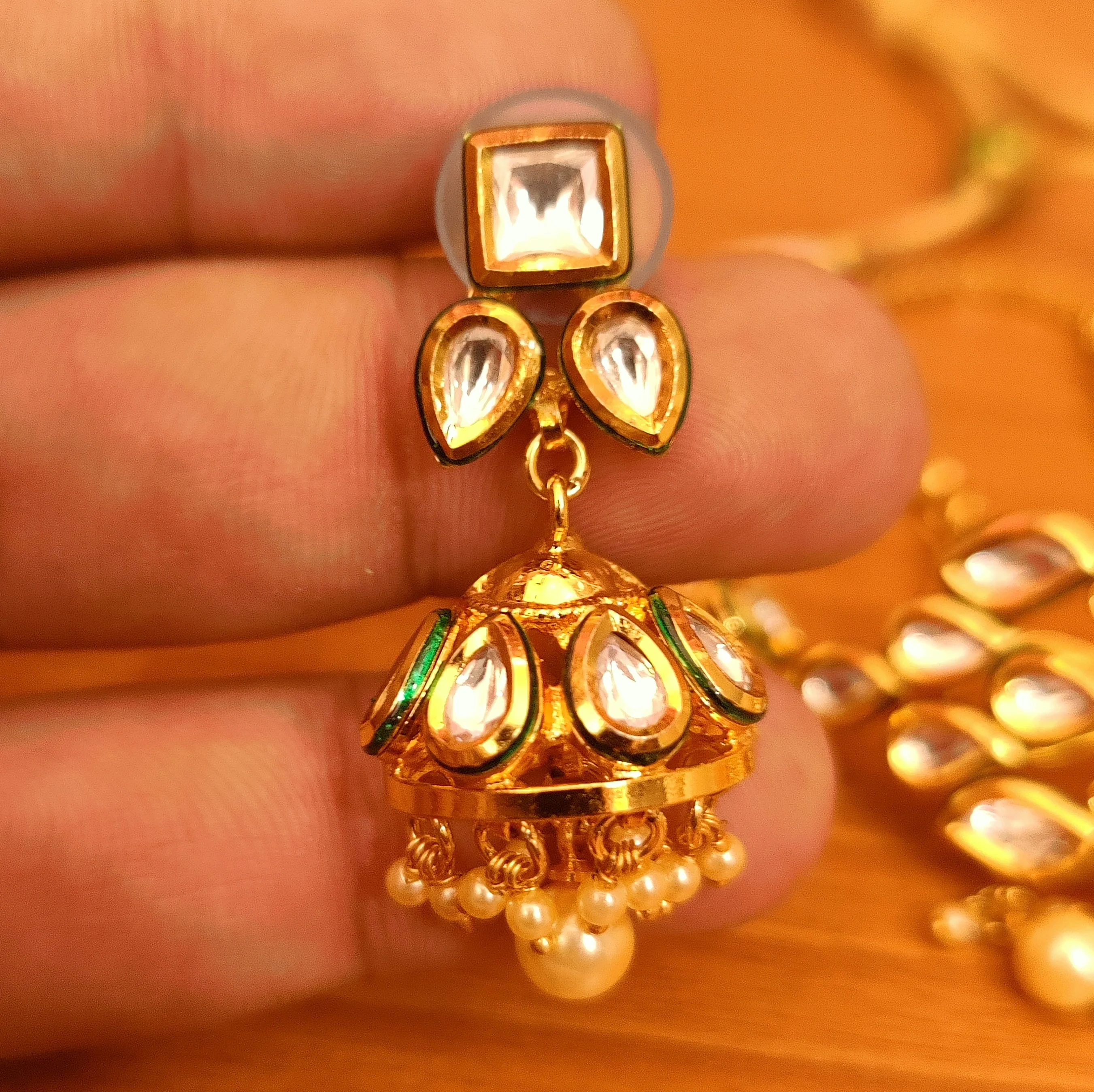 This beautiful necklace set is handcrafted in brass alloy with imitation kundan work of very fine quality . This necklace set is coated with 18 kt gold polish which give them a unique look . An absolutely stunning piece to own and are very light in weight.