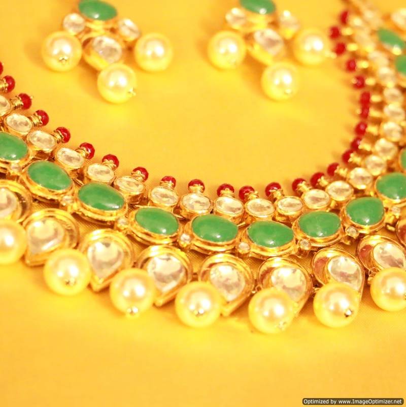 This beautiful necklace set is handcrafted in silver alloy with pearls kundan and semi precious stones work done on the necklace set  . This necklace set is coated with 18 kt gold polish which give them a unique look . An absolutely stunning piece to own and are very light in weight. Â