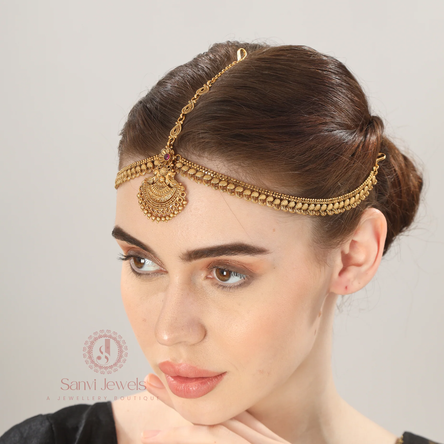 This polki gold look mathapatti is handcrafted in copper alloy with 18kt fine gold plating and red colour polki stones & gold bead of very fine quality. this mathapatti is very light in weight and gives you a real gold look. an absolutely stunning piece to own and are very light in weight.