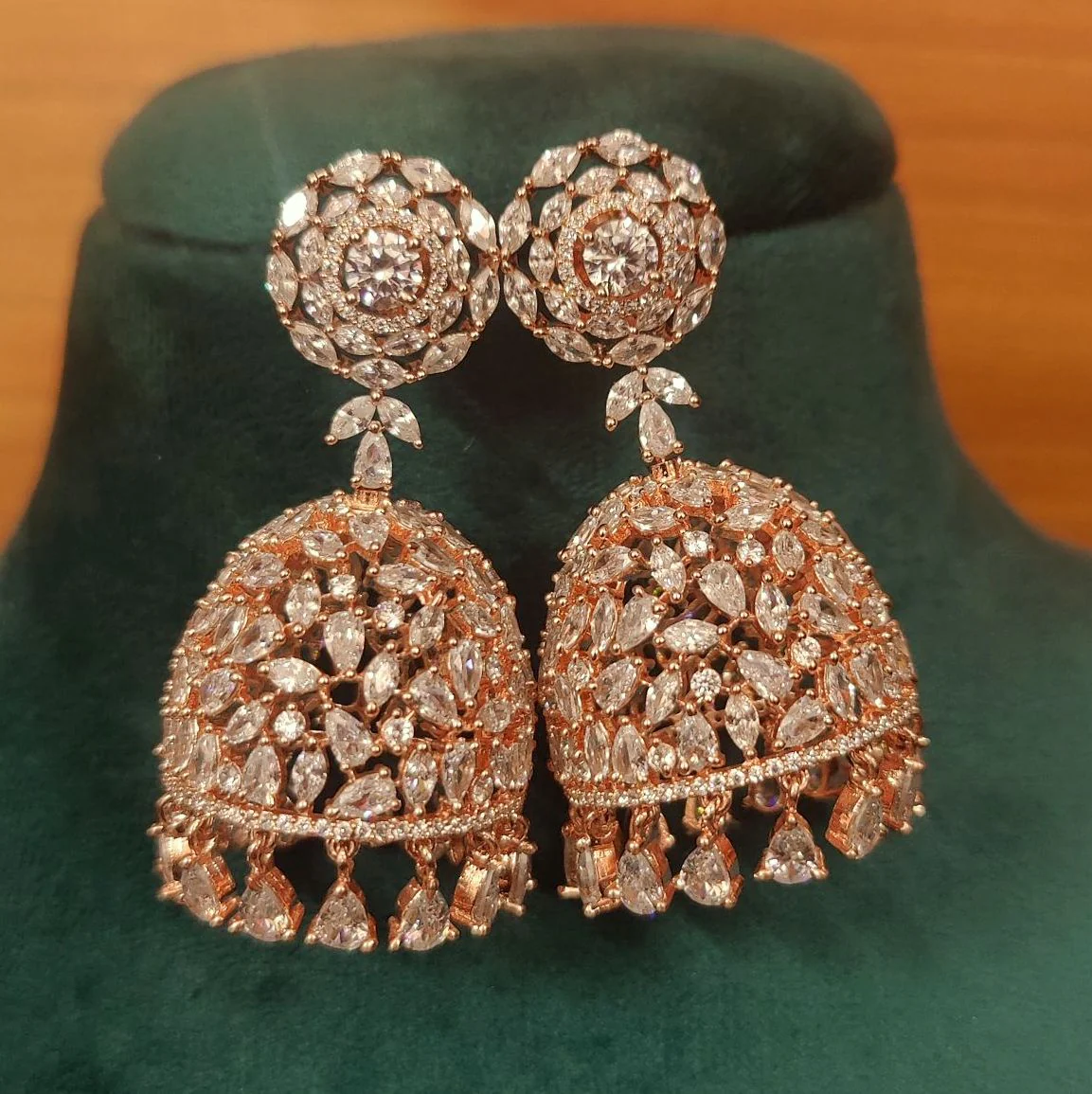 These diamond look jhumka are handcrafted in silver alloy with imitation cz stones of very fine quality. These earrings are plated in 18kt rose gold rhodium plating which gives the design a real jewelry look .
