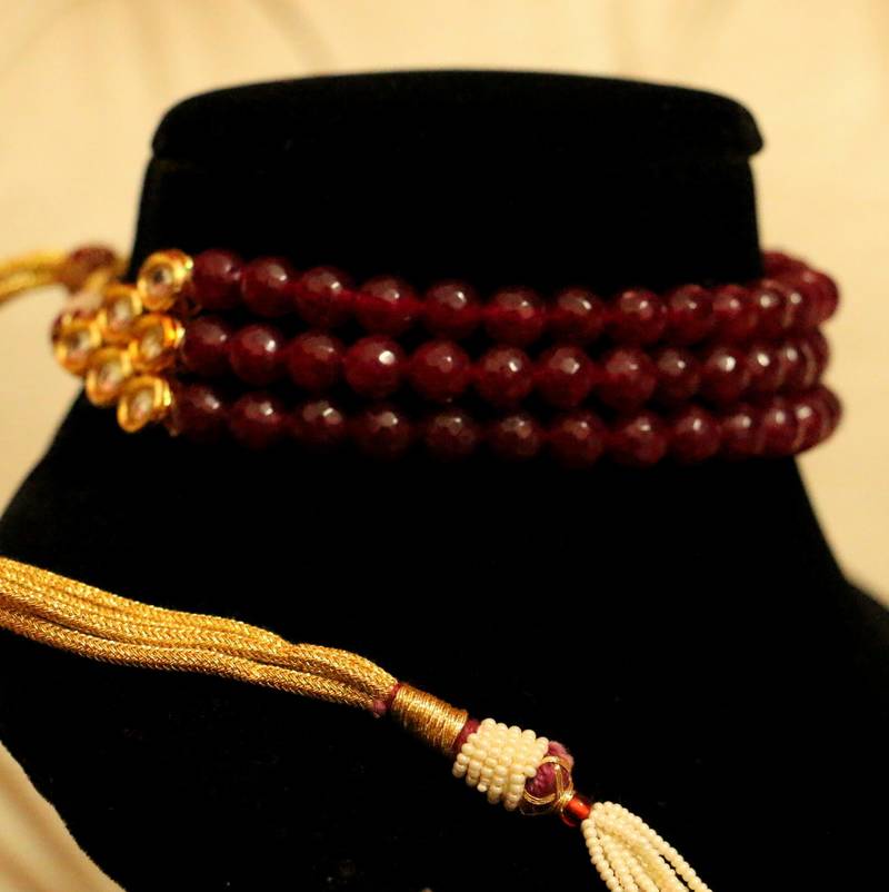 This beautiful necklace is handcrafted in brass alloy with imitation ruby beads & kundan with meenakari work of very fine quality . This necklace is coated with 18 kt gold polish which give them a unique look . An absolutely stunning piece to own and are very light in weight.